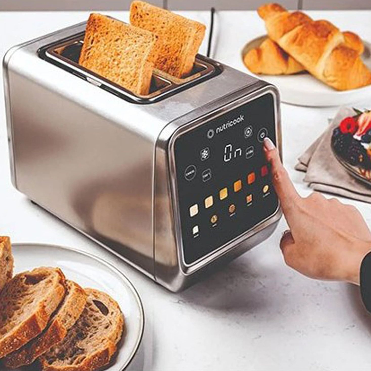 توستر نوتریکوک NC-TS201 با 2 درگاه، توان 850w و نمایشگر LED دارای 3 عملکرد برشته کردن، گرم کردن مجدد و یخ زدایی و 5 برنامه باگل، شیرینی، مافین، نان و وافل است.