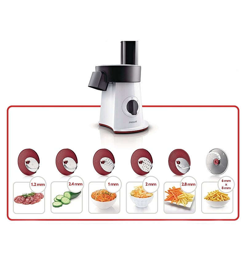 دارای 6 دیسک استیل ضد زنگ برای ورقه کردن، رنده کردن و خلال کردن سبزیجات – دارای دهانه عریض – قابل استفاده برای انواع سبزیجات، پنیر، سیب زمینی و گوشت – قابلیت شستشوی اجزا (به جز بدنه اصلی) در ماشین ظرفشویی – محل نگهداری کابل برق – دارای سیستم ایمنی |
