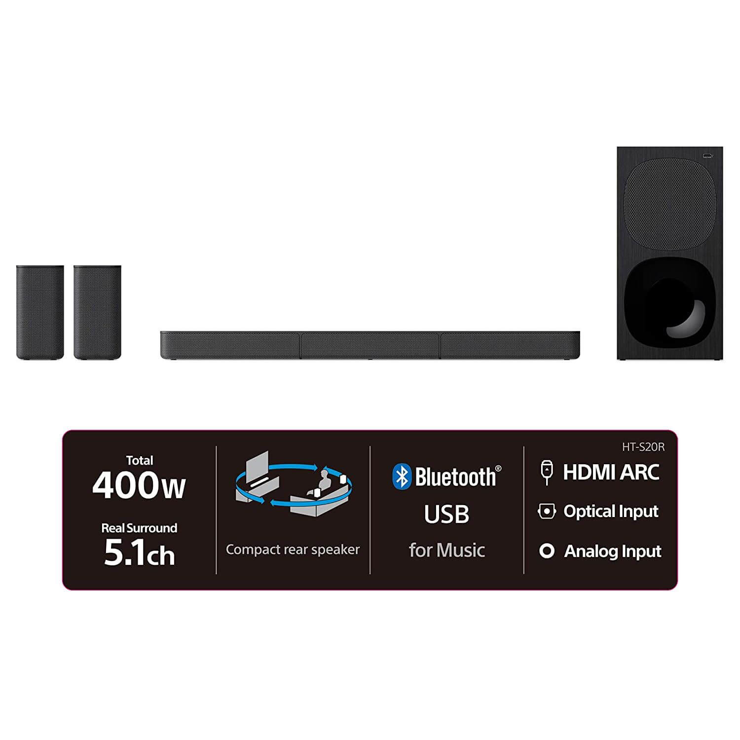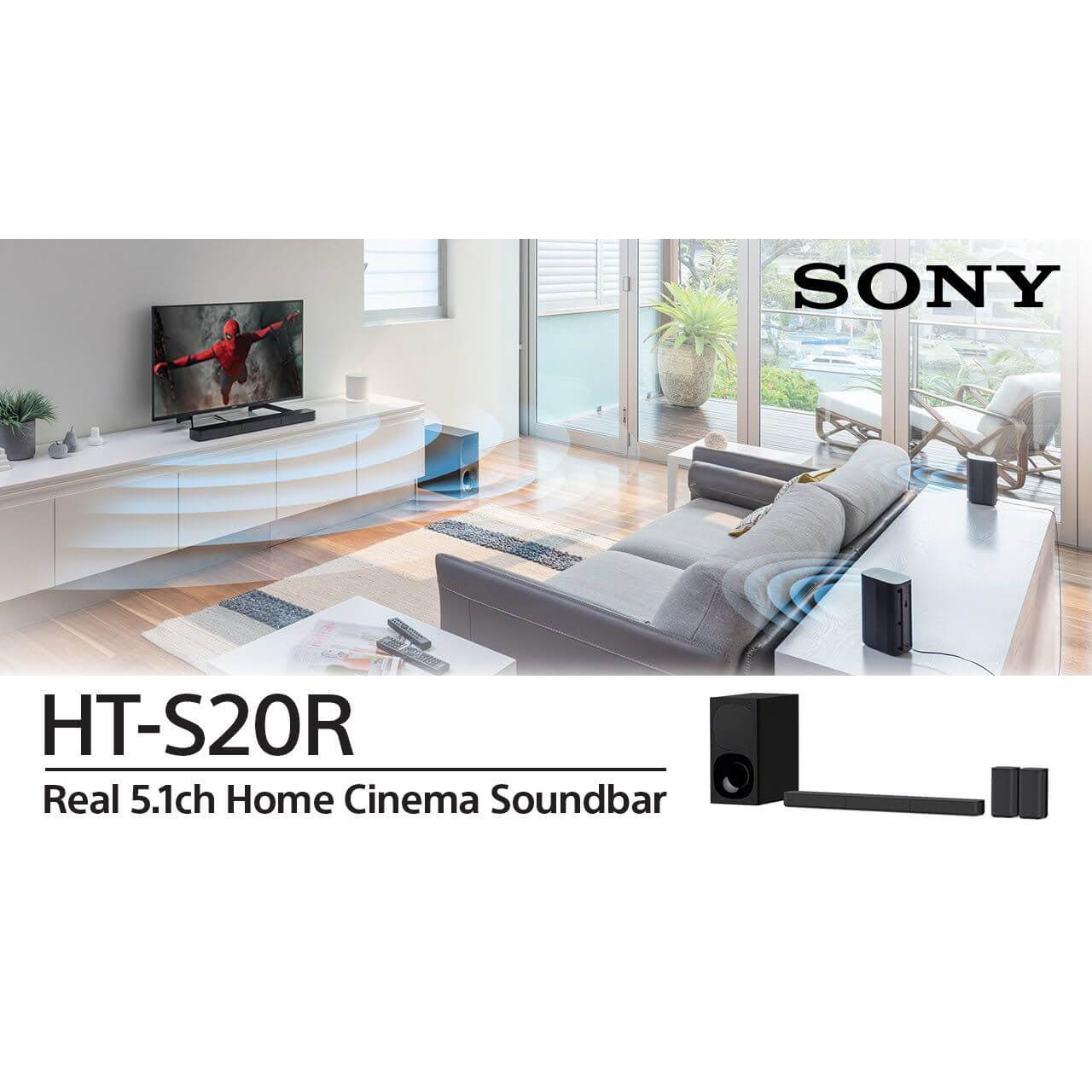 ساندبار سونی HT-S20R یک سیستم صوتی مکمل در کنار تلویزیون شما است. این محصول از دو اسپیکر مکعبی، یک ساب ووفر، یک اسپیکر مرکزی و یک کنسول کنترل کننده تشکیل شده است؛ درنتیجه یک سیستم صوتی 5.1 کاناله را تشکیل میدهد. نحوه ی اتصال این سینمای خانگی، یکی از دو راه خروجی HDMI و خروجی صدای اپتیکال است.