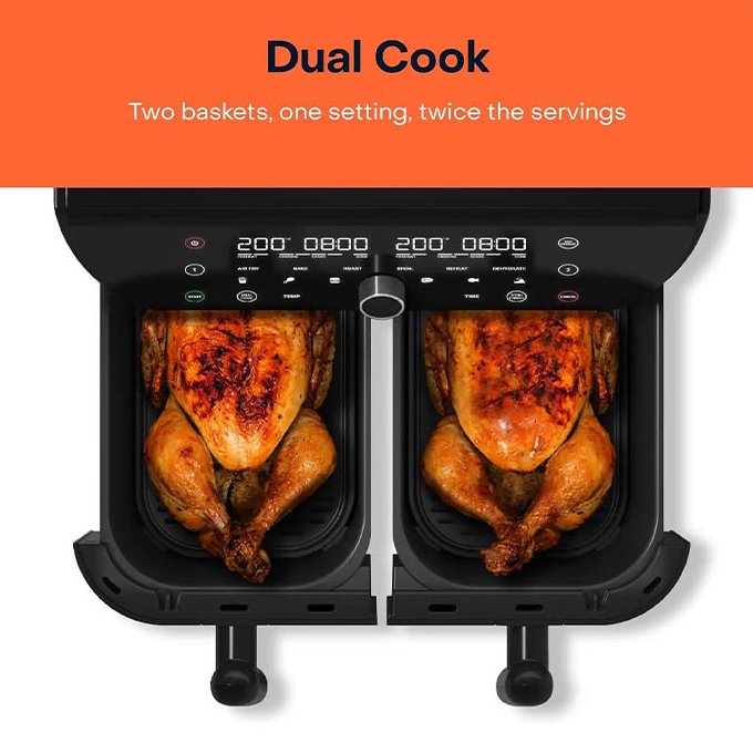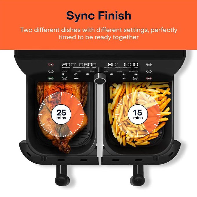 ظرفیت 8.5 لیتری سرخ کن دوقلو نوتریکوک مدل AFD185، آن را به گزینه ای ایده آل برای خانواده های پر جمعیت 7 تا 8 نفر تبدیل کرده و امکان استفاده همزمان از هر دو سبد پخت برای آماده سازی سیب زمینی، مرغ، میگو، ماهی، گوشت، همبرگر، سبزیجات، اسنک، پیتزا، دسر، و … را توسط برنامه Sync Cook به شما می دهد. به همین دلیل یکی از محصولات حرفه ای و شناخته شده در بازار بوده و با قیمتی عالی در اختیار شما قرار گرفته است.