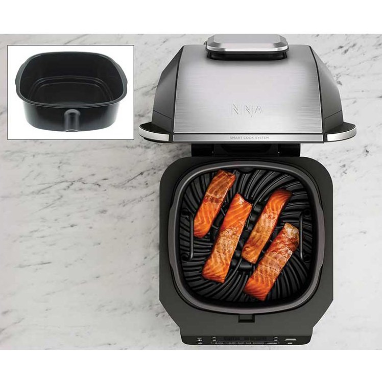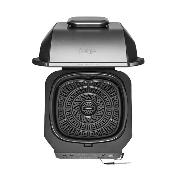 سرخ کن و گریل نینجا EG351 با نمایشگر LCD، ظرفیت 5.7 لیتر، توان 1760 وات، دماسنج هوشمند، کانوکشن و تایمر به قابلیت خشک کردن، گریل، پختن و کباب کردن مجهز است.