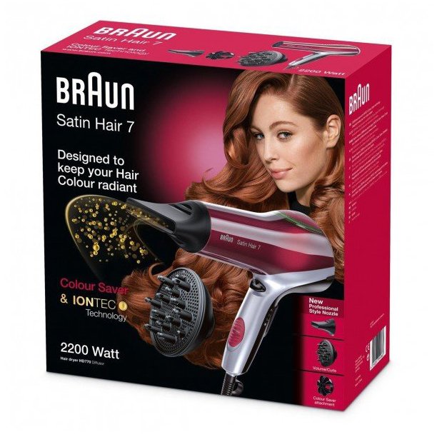 سشوار براون مدل Satin Hair 7 HD770 با توان 2200 وات یکی از سشوارهای قدرتمند بازار به شمار می آید و برای حالت دهی به مو، خشک کردن و صاف کردن استفاده مورد استفاده قرار می گیرد. این مدل با کابل برق 3 متری حرکت آزادانه تری را برای کاربر امکان پذیر می کند و 2 سری متمرکزکننده هوای آن هدایت دقیق تر جریان باد به سمت بخشی از مو قادر است فرآیند خشک کردن و حالت دهی مو را با سرعت بالاتری انجام دهد.