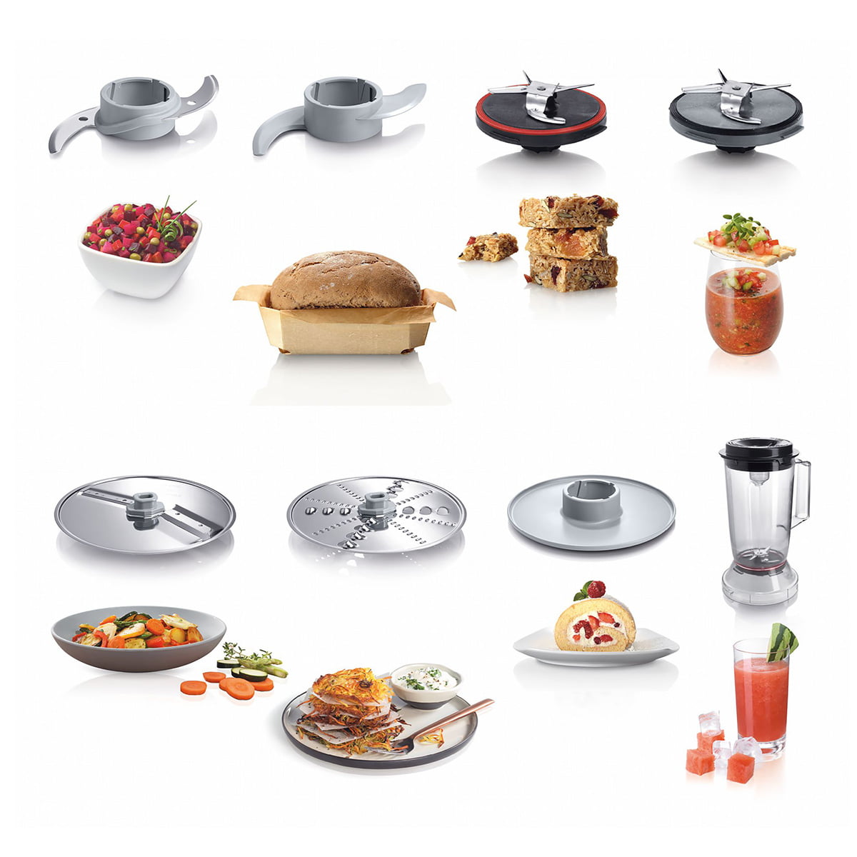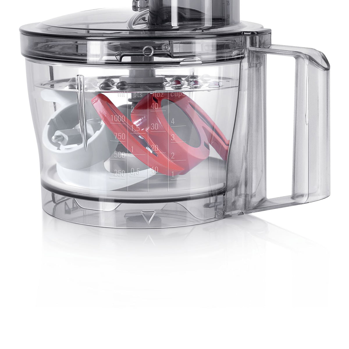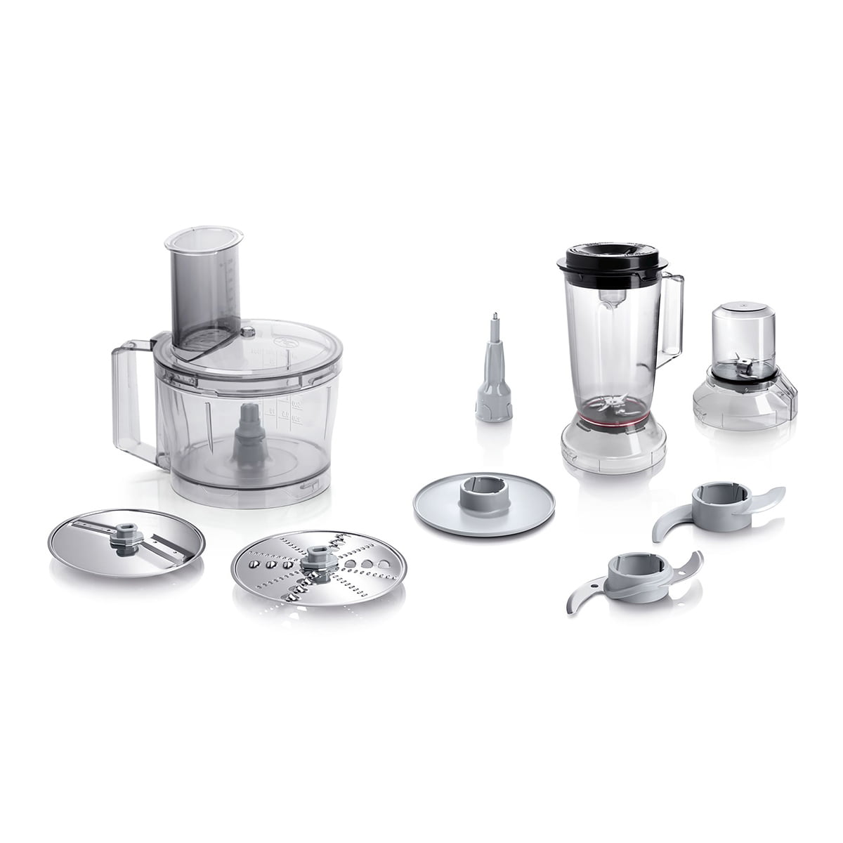 در بالای بدنه ی اصلی، ظرف خردکن متصل میشود تا با اتصال تیغه ها و دیسک های رنده ی مختلف، عملکردهای متفاوتی مثل ریزکردن، خردکردن، رنده در اشکال مختلف و حتی قابلیت خمیرزن در دستگاه مشاهده شود.