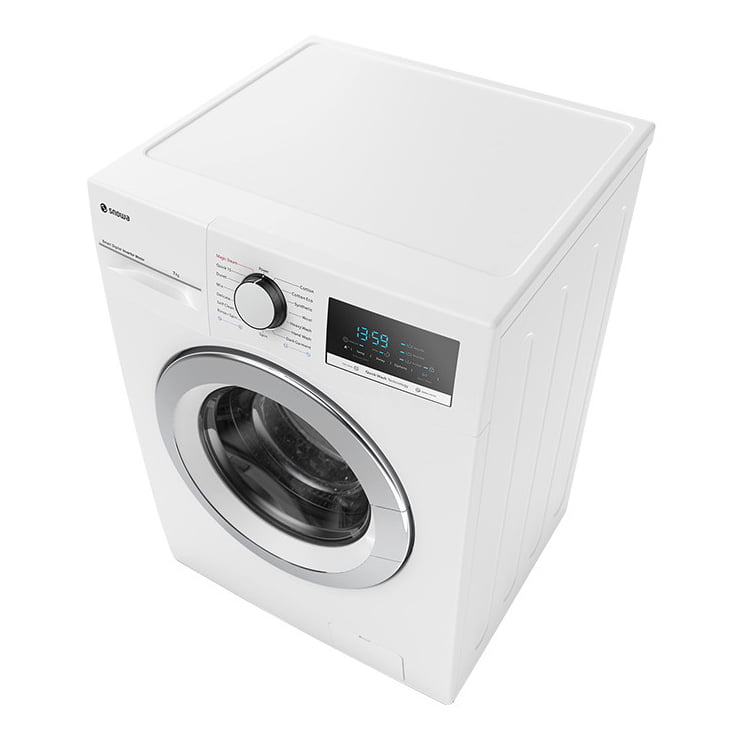 لباسشویی اسنوا SWM-71201 نوع درب از جلو، به رنگ سفید و درب کروم، سرعت چرخش موتور 1000 دور در دقیقه، دارای 15 برنامه شستشو، با ابعاد 60 × 60 × 83 cm و ظرفیت 7 کیلوگرمی مناسب خانواده هایی با جمعیت متوسط است.