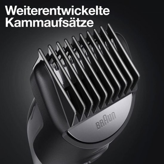 ماشین اصلاح براون MGK7331 دارای عملکرد ضد آب، موتور AutoSense، باتری لیتیوم یون با نشانگر روی بدنه، شارژ سریع 5 دقیقه، شانه های قابل تنظیم و تیغه استیل است.