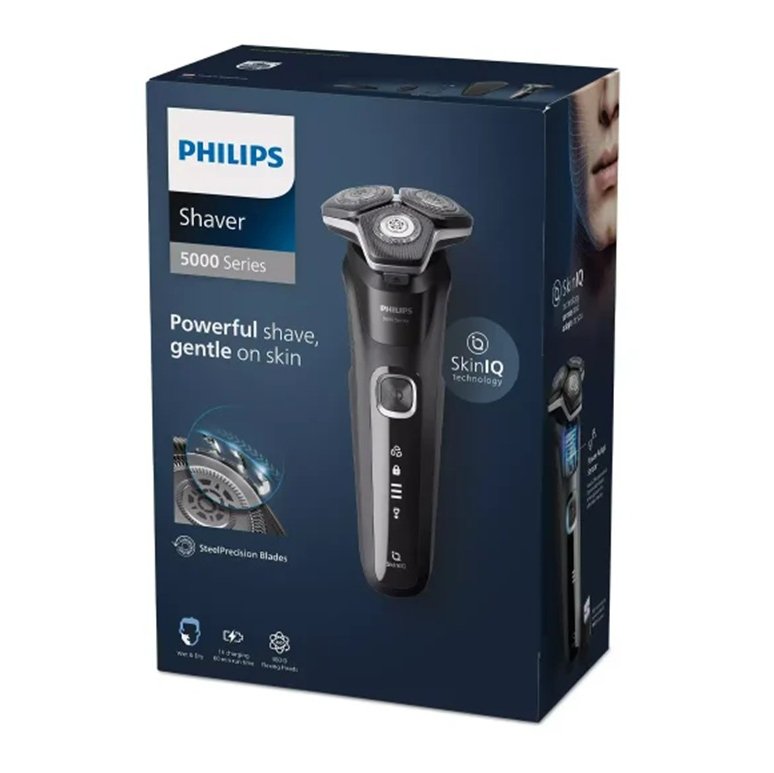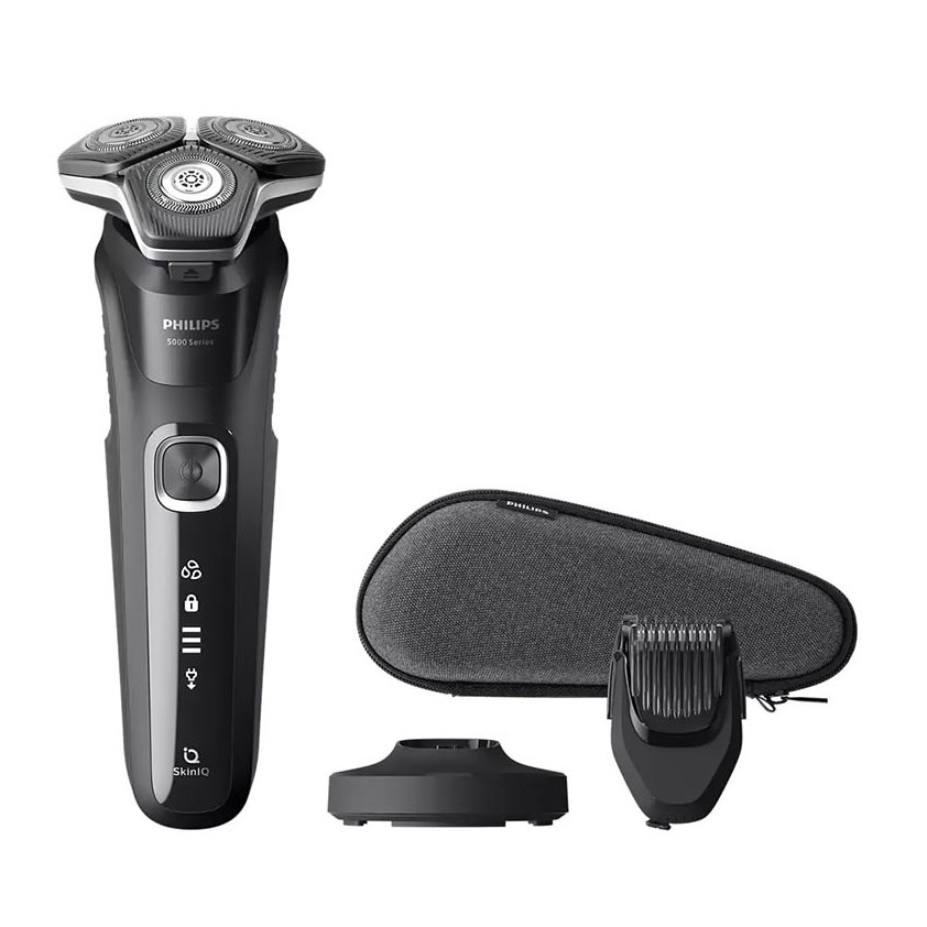 ماشین اصلاح فیلیپس S5898/38 دارای عملکرد برش چرخشی، ضدآب، 45 تیغه خودتیزشونده، باتری Li-Ion با شارژ سریع 5min، تریمر بینی و گوش، سنسور Power Adapt و SkinIQ است.
