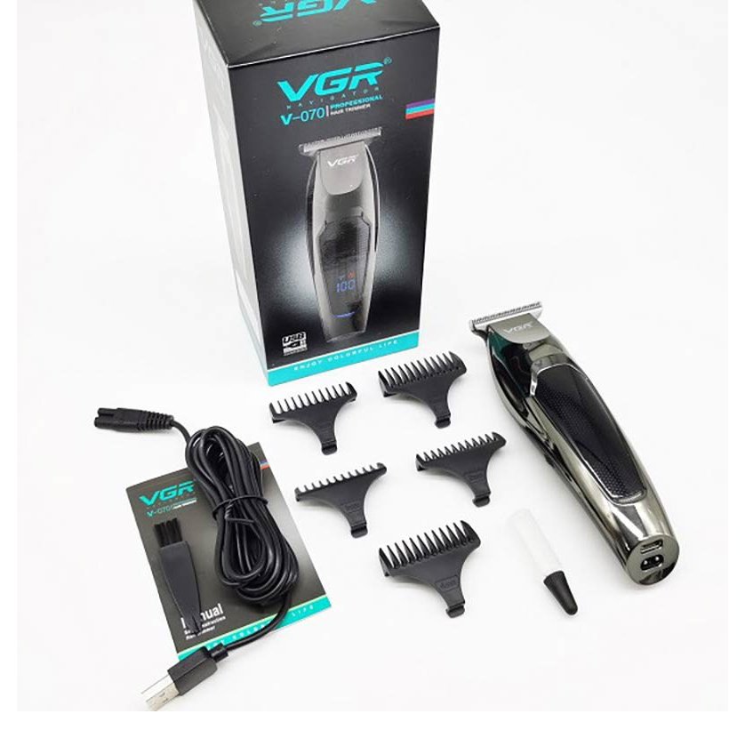 ماشین اصلاح وی جی آر V-070 مجهز به باتری لیتیوم یون با مدت زمان کارکرد 120 دقیقه، حالت توربو، نمایشگر LED، پنچ عدد شانه متنوع و قابلیت خط زن می باشد.