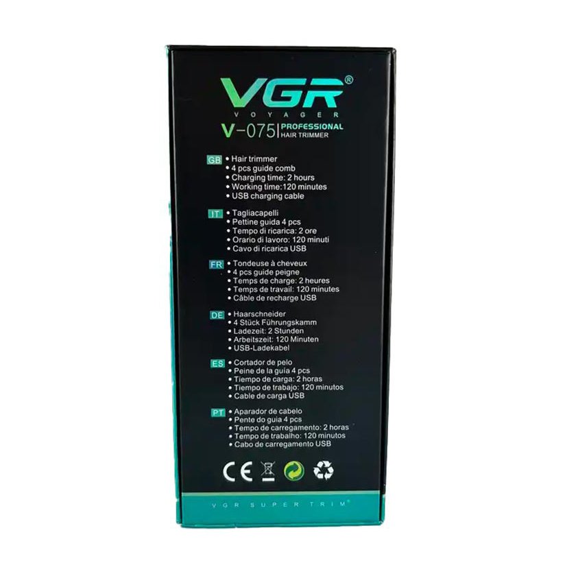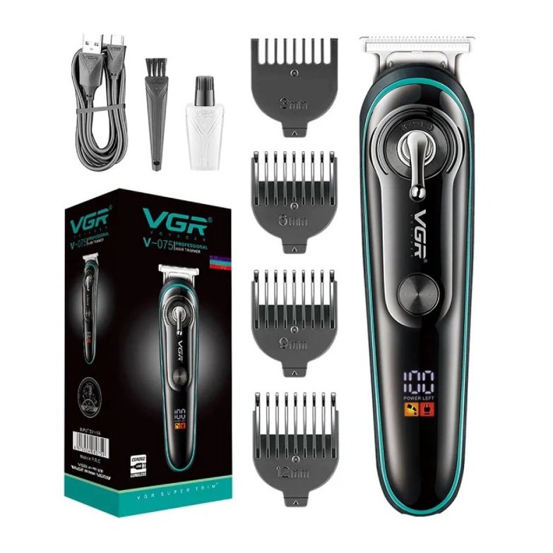 ماشین اصلاح وی جی آر V-075 مجهز به باتری لیتیوم یون قابل شارژ، شارژ کامل در عرض 2 ساعت، نمایشگر LED، تیغه استیل ضد زنگ و قابلیت خط زن می باشد.