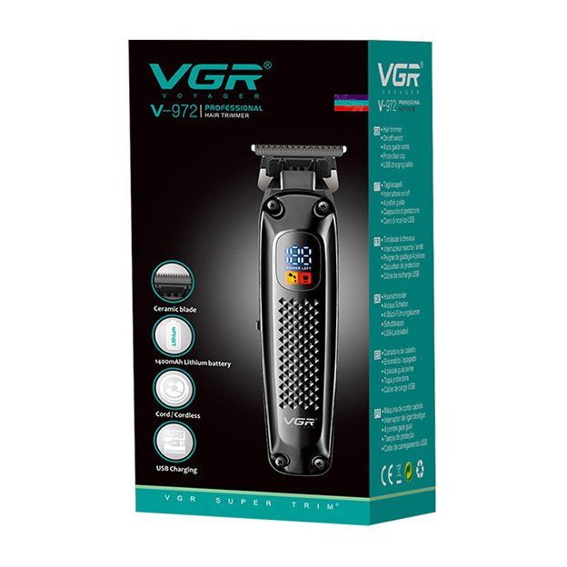 ماشین اصلاح وی جی آر V-972 مجهز به تیغه استیل ساخته شده با فرآیند متالوژی پودری، باتری لیتیوم یون با 2 ساعت شارژ و 180 دقیقه مدت کارکرد و چهار عدد شانه می باشد.