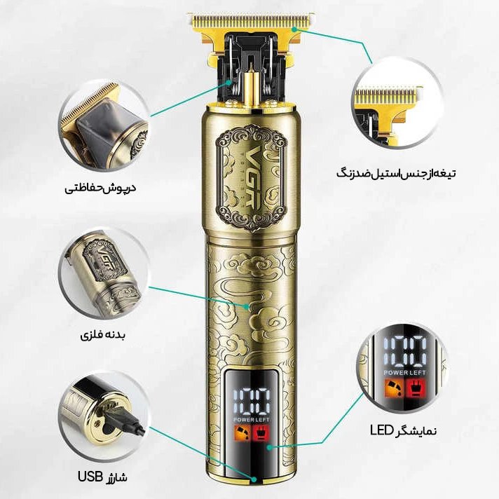 ماشین اصلاح وی جی آر VGR V-073 دارای عملکرد بی سیم، باتری لیتیوم یون 1500mah، نمایشگر LED، تکنولوژی برش مستقیم، تیغه استیل ضد زنگ، 4 شانه، خط زن و صفر زن است.