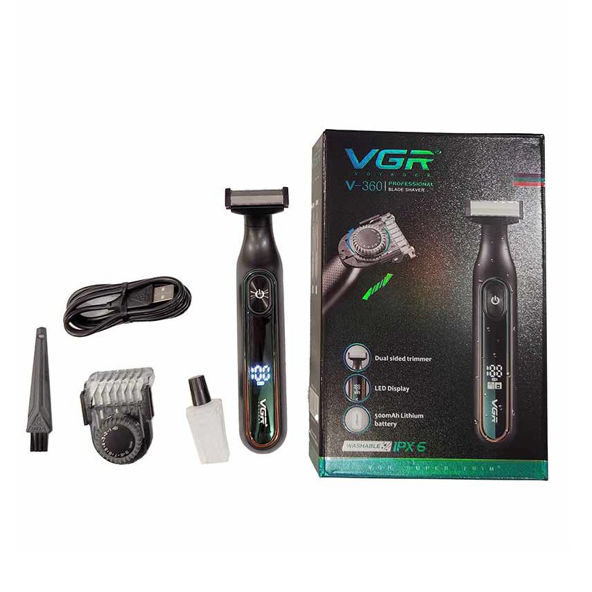ماشین اصلاح وی جی آر VGR V-360 مجهز به بدنه ضد آب IPX6، صفحه نمایش LED، تیغه استیل ضد زنگ دو طرفه و شانه اصلاح قابل تنظیم از 0.1 تا 9 میلی متر می باشد.