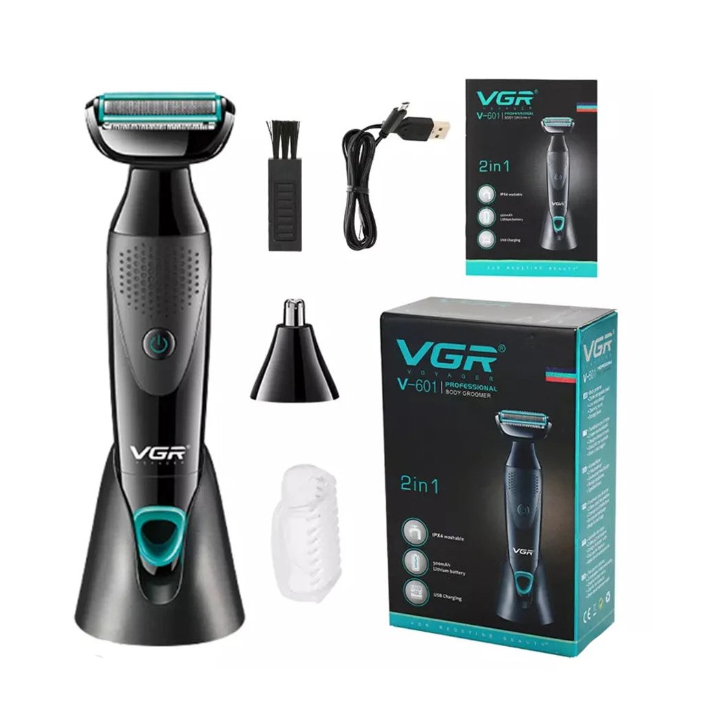 ماشین اصلاح وی جی آر VGR V-601 مجهز به بدنه ضد آب با گواهی IPX4، موتور لیتیوم یون 500 میلی آمپر، خط زن دو طرفه، سری بینی و گوش و شانه ته ریش می باشد.