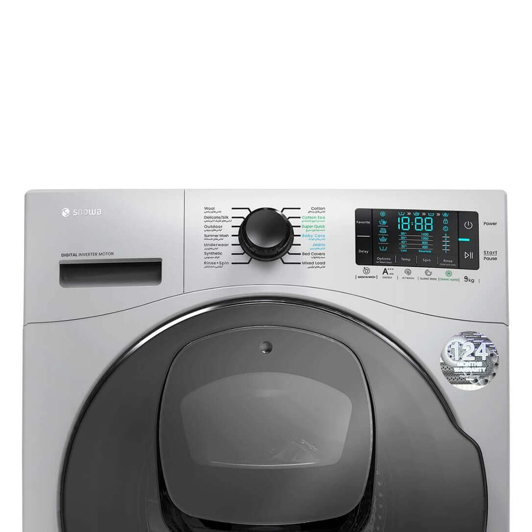 ماشین لباسشویی اسنوا SWM-F92S مجهز به فناوری Blue Shine برای ضد عفونی کردن لباس، برنامه Jet Wash، شستشوی سریع و شستشوی اختصاصی لباس کودک است.