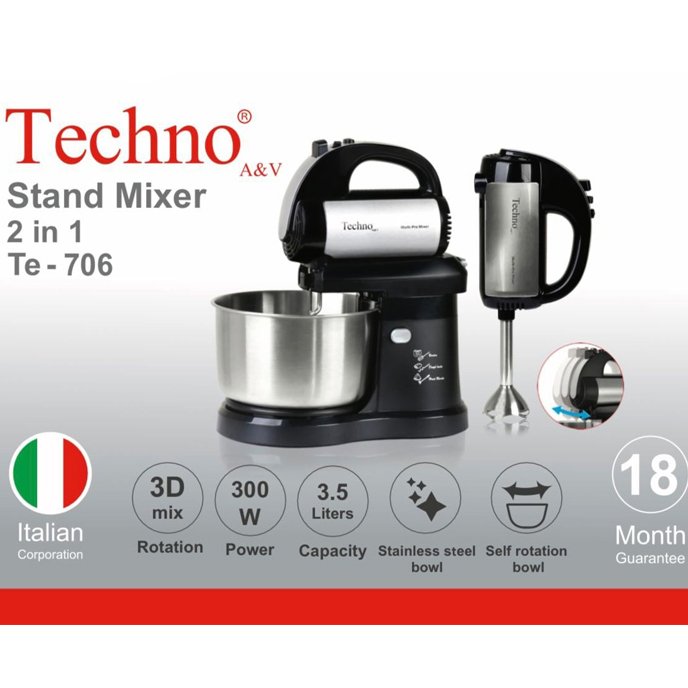 همزن کاسه دار تکنو مدل TE‑706 موتوری قدرتمند با توان 300 وات دارد و علاوه بر همزدن انواع مواد مانند خمیر سنگین و خامه سبک، به عملکردهای خمیرزن و گوشتکوب نیز مجهز می باشد. کاسه 3.5 لیتری آن از جنس استیل است و پس از ریختن مواد غذایی، جهت مخلوط شدن بهتر و یکنواخت شدن مواد درون آن، به طور اتوماتیک شروع به چرخش کرده و از خستگی کاربر جلوگیری می کند.
