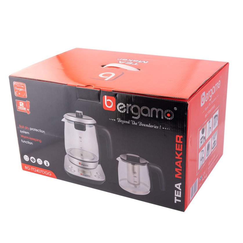چای ساز برگامو BG-TT2407DGG از نوع روی هم بوده که کتری شیشه ای دارای ظرفیت 1.7 لیتری و قوری آن 1.2 لیتری می باشد. سیستم خاموشی خودکار از امکانات این محصول است.