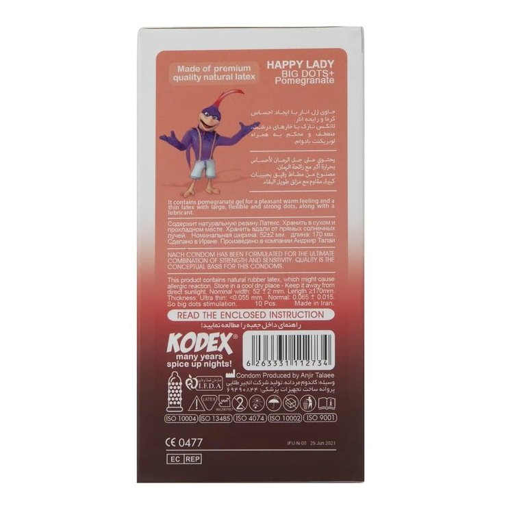 کاندوم ناچ کدکس هپی لیدی محصولی است که با هدف ارتقاء کیفیت رابطه جنسی و تضمین ایمنی بهداشتی طراحی شده است و جنس آن از لاتکس طبیعی و باکیفیت است که خاصیت ضد حساسیت دارد. یکی از مهم ترین ویژگی های آن، ساختار خاردار درشت در سطح کاندوم است که با هدف افزایش تحریک فیزیکی بانوان طراحی شده است.