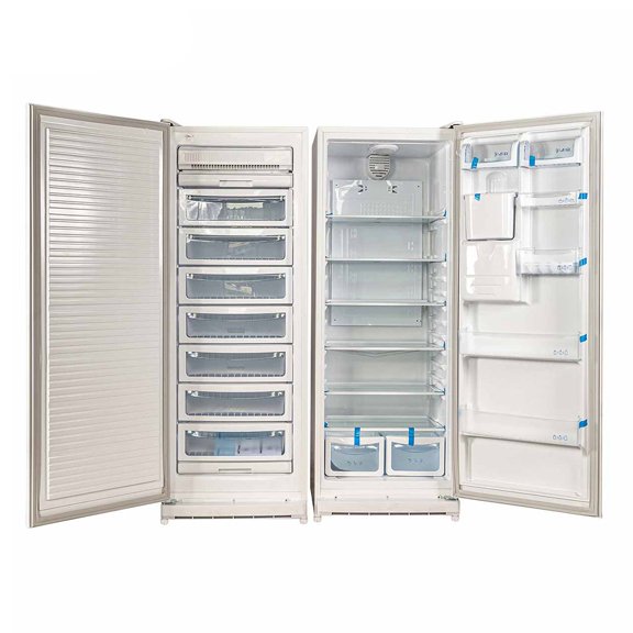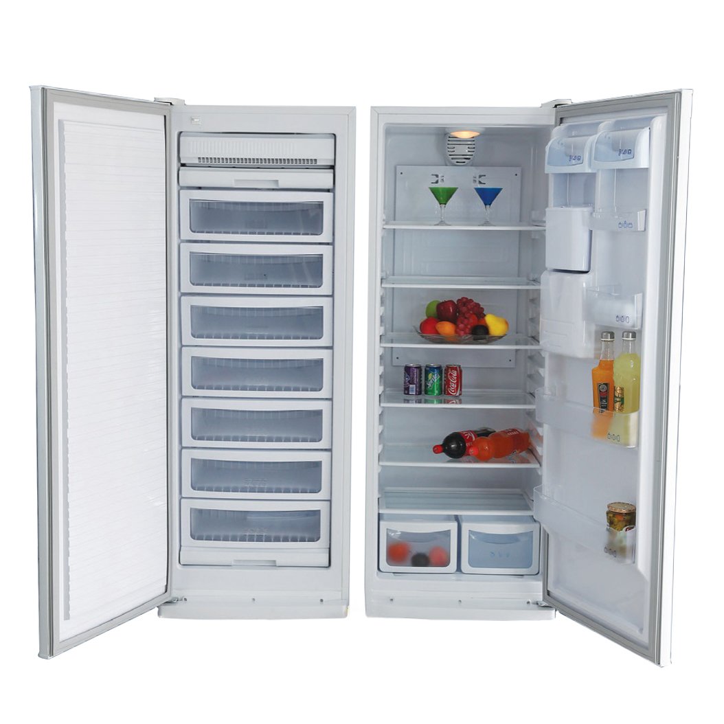 یخچال فریزر دوقلو یخساران D 8001-D 8005 S مجهز به سیستم آبریز نیمه اتومات و سیستم اخطار باز ماندن درب است. ظرفیت کل این محصول 32 فوت یا 742 لیتر است.